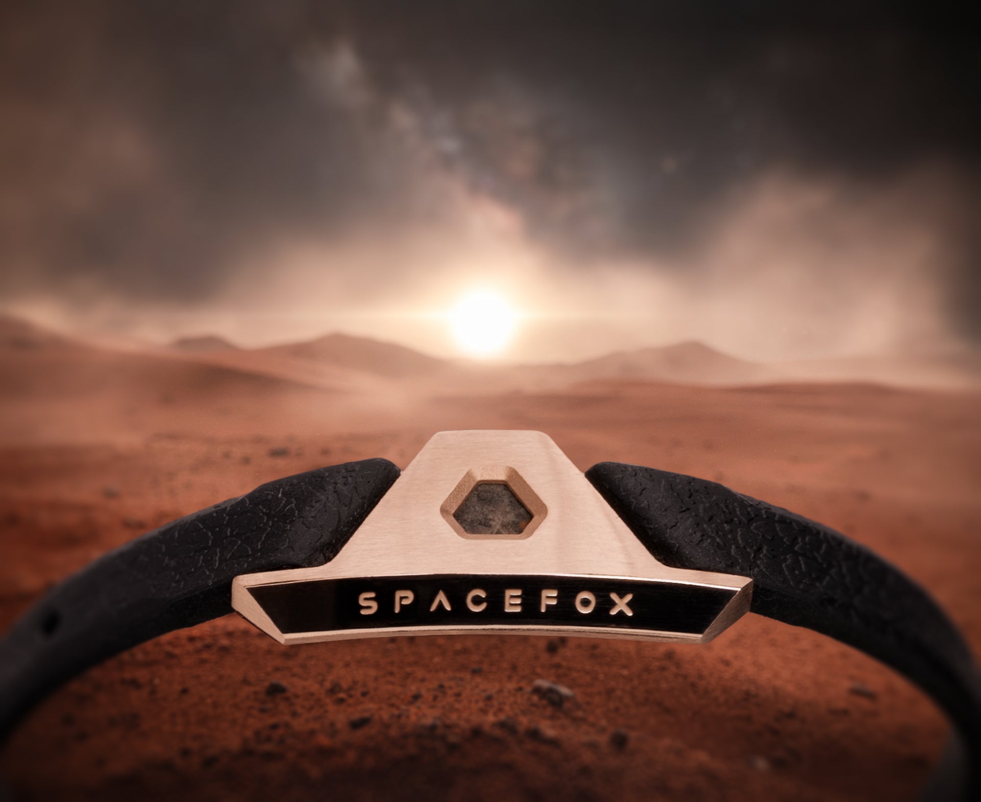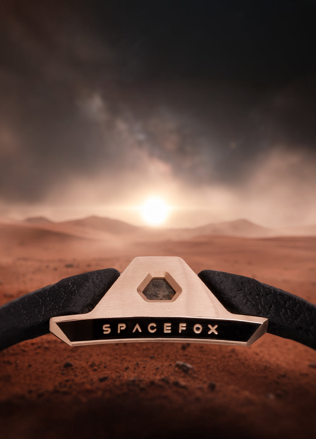 Une météorite provenant de Mars authentifiée par la Meteoritical Society est insérée sur un étincelant bracelet en Acier 316L finition or rose. Le bracelet MARS fait de vous un pionnier.